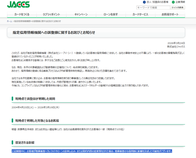 指定信用情報機関への誤登録に関するお詫びとお知らせをの案内(JACCS)や、