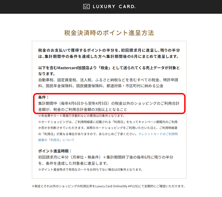 ラグジュアリーカードでの納税利用で1.5%~1%還元を受けるには少し条件があります。