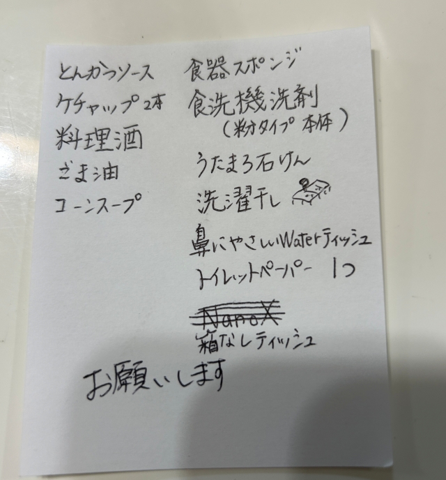 もちろんトイレットペーパーを始め日用品や卵や牛乳などの食品もたくさんその日に買い込みます。20日には奥さんにこのようなメモ書きを渡され、買い物に行ってます(笑)